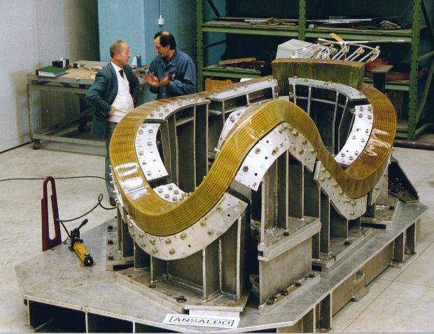 Die Wicklung der Probespule hatte ein Unterauftragnehmer übernommen, die italienische Firma Ansaldo in Genua. Die einzelnen Leiterlagen, die zur elektrischen Isolation mit Glasfaserbandagen umwickelt werden, müssen sehr präzise in ihre Wickelform gepreßt werden. Zur Versteifung wird das fertige Wickelpaket anschließend mit Epoxidharz imprägniert. Zusätzliche Verstärkung gibt ein Stahlgehäuse - bei der Firma Thyssen Guss AG/ Ennepetal hergestellte Gußteile - worin das Wickelpaket eingeschweißt wird.