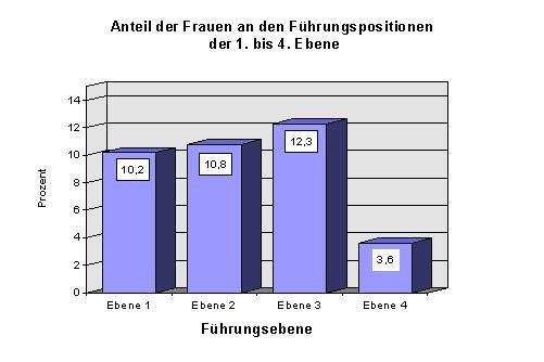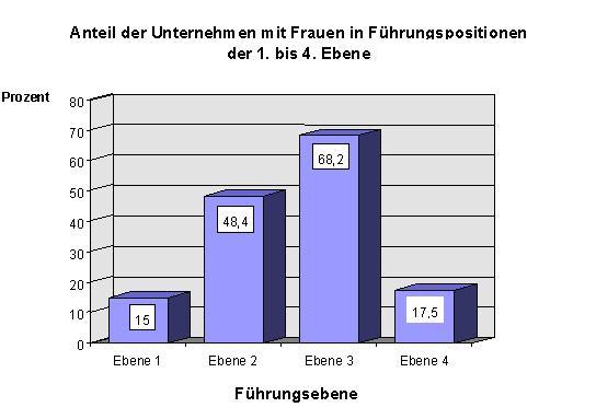 Wie die Umfrage jedoch auch belegt, spiegelt die noch immer geringe Zahl an Frauen in Führungspositionen die männlich dominierten Machtstrukturen in der Wirtschaft und der öffentlichen Verwaltung wieder. Auf dem Weg in die Chefetagen stoßen Frauen in Unternehmen an unsichtbare Grenzen. Je höher die Ebene der beruflichen Hierarchie, um so geringer ist der Anteil der Unternehmen, die Frauen in den entsprechenden Führungsebenen beschäftigen. Während auf der 3. Führungsebene (Sachgebiets-, Gruppen-, Teamleiter) fast 70 Prozent der Unternehmen Frauen beschäftigen, sind es auf der 2. Ebene (Abteilungsleiter, Prokurist) nur mehr 50 Prozent und auf der 1. Ebene (Geschäftsführer, Betriebsleiter) lediglich noch 15 Prozent. Der geringe Anteil an der Ebene 4 (Meister, Vorarbeiter) beruht vor allem auf dem bekannten Sachverhalt, daß Frauen eher selten in der Produktion oder in technischen Berufen tätig sind.