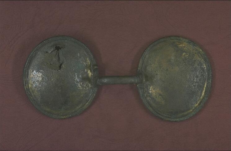 Eine der untersuchten Fibeln (Gesamtlänge 14,4 cm) mit lagerungsbedingten Destruktionserscheinungen. Auf der linken Platte befindet sich auf der Rückseite eine Originalreparatur des bronzezeitlichen Handwerkers, da der Guß dieses Stückes nicht vollkommen gelang. Zum Zeitpunkt der Bergung im Sommer 1908 erschien die Vorderseite dieser Gewandspange eben, wie auf alten Fotografien, die kurz nach der Bergung aufgenommen wurden. Nun weist die Fibel Risse und Löcher auf, wie auf der linken oberen Seite zu erkennen ist.