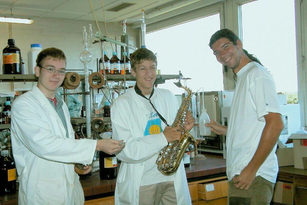 Wenn Udo Schmidt und Wolfgang Kühnl nach Hamburg fahren, ist Tobias J. Zimmermann schon wieder im heimischen Riedlingen. Und mit ihm sein Saxophon, das - nur für den Photographen - die Laborszenerie belebte. "Ich spiele in mehreren Jazzbands mit." Abends verbindet er Töne zu Harmonien, tagsüber chemische Substanzen zu neuen Verbindungen.