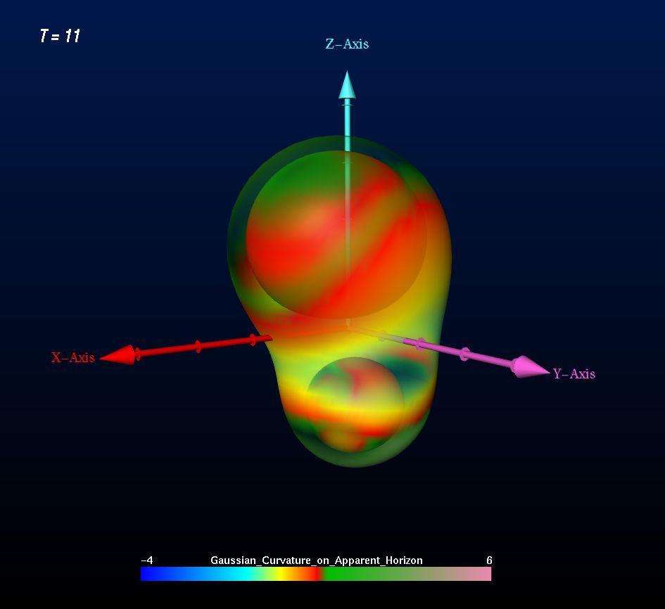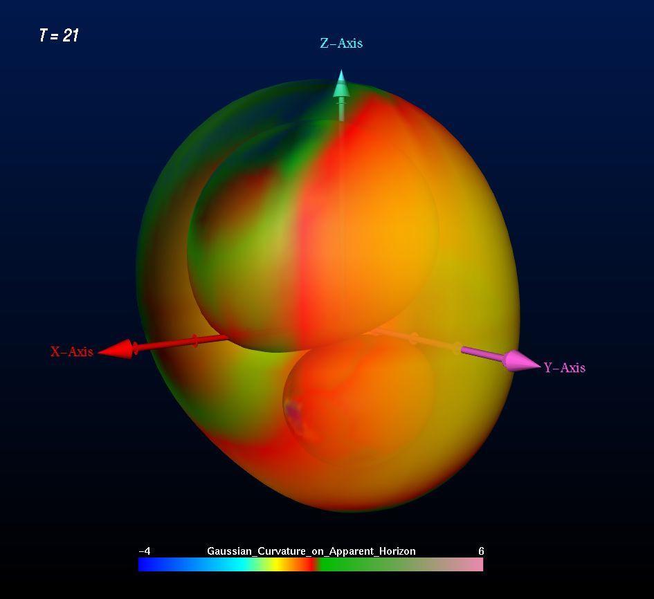 Für die Analyse der riesigen, Terabyte großen Datenmengen der Simulationen verwendet die Gruppe Visualisierungssoftware, die am Konrad-Zuse-Zentrum in Berlin entwickelt wurde, und die von W. Benger für die Behandlung von Schwarzen Löchern adaptiert wurde. Diese Software erlaubt es, die Daten in anschauliche Bilder umzusetzen und damit Animationen zu erzeugen, die es den Wissenschaftlern ermöglichen, die Vorgänge beim Simulationsprozeß der Kollision Schwarzer Löcher zu verfolgen. Drei Wochen lang wurde von NCSA und SGI ein spezieller Graphikhochleistungsrechner zur Verfügung gestellt, mit dem Benger beeindruckende Visualisierungen des Kollisionsprozesses aus den numerischen Daten erzeugen konnte. Sie zeigen, wie Schwarze Löcher verschmelzen, und wie während des Verschmelzungsvorgangs explosionsartig Gravitationswellen ausgesandt werden, wie sie womöglich schon bald von Gravitationswellendetektoren wie GEO bei Hannover nachgewiesen werden.