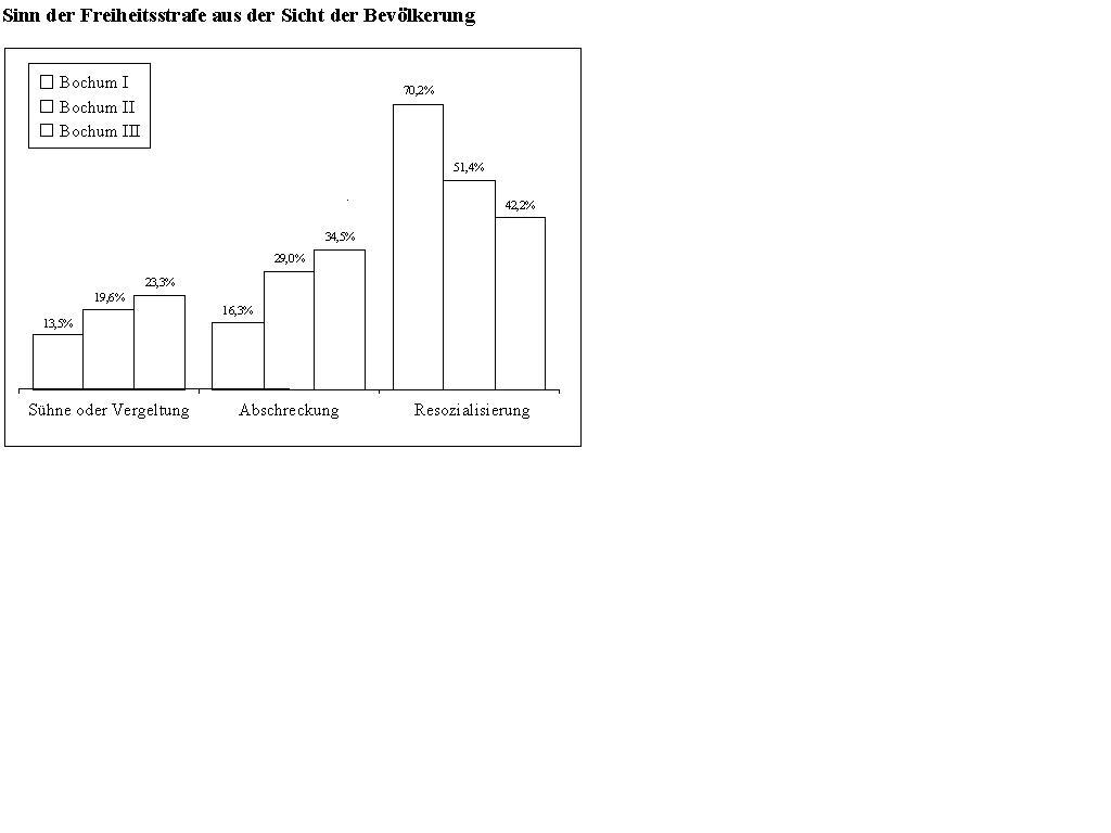 Nach einer repräsentativen Langzeitstudie des Bochumer Kriminologen Prof. Dr. Hans-Dieter Schwind hat sich die Einstellung der Bevölkerung zu den Zielen des Strafvollzuges in den letzten 24 Jahren deutlich verändert. Je weniger Menschen der Resozialisierung das Wort reden, desto mehr sehen in der Sühne bzw. Vergeltung und Abschreckung den Zweck der Gefängnisstrafe.