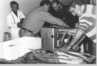 Präparator Sieghard Diekmann vom Naturwissenschaftlichen Lehrmittel-Institut in Detmold hatte auf der Rückreise von Bremerhaven frischen Seelachs im Gepäck, zum Teil als Rundfisch ohne Kopf, zum Teil vom früheren Fischmeister Karl-Heinz Schäfer zu Filet geschnitten. Eine Mahlzeit wird sich Diekmann durchaus aber nicht bereiten, er hat mit dem Seelachs etwas gänzlich Anderes vor: In einem komplizierten, aber inzwischen längst erprobten Verfahren wird er die Flüssigkeit im Fischfleisch durch einen Kunststoff ersetzen.