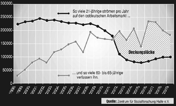 Schon in wenigen Jahren droht in den neuen Bundesländern ein riesiger Mangel an Arbeitskräften, so der Chemnitzer Wirtschaftswissenschaftler Prof. Peter Pawlowsky. Besonders kleine und mittlere Betriebe könnten dadurch in ihrer Existenz gefährdet sein. Der Grund: In ostdeutschen Firmen überwiegen mittlere und ältere Arbeitnehmer, die in den kommenden Jahren ausscheiden. Wegen des drastischen Geburtenrückgangs nach der Wende wachsen aber kaum neue Arbeitskräfte nach.