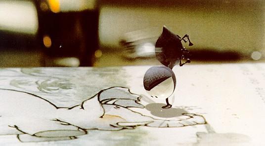 "Bsss" ist eine Kombination von 3D-Computeranimation mit Realfilm. "Das war nicht von vornherein so geplant," erzählt Felix Gönnert. "Mit Hilfe der Figur der Fliege, die ich nach einer Skizze anfertigte, wollte ich eigentlich nur einige Funktionen des Animationsprogramms Maya ausprobieren und zur Übung eine kurze Animationssequenz gestalten. Aber die Fliege gefiel mir bald so gut, dass mir immer mehr einfiel, und so wurde das Ganze schließlich zu meinem Vordiplomfilm. Ein Kommilitone machte mir Fotos von seiner Küche, die filmten wir mit der Trickkamera einzelbildweise als Hintergrund ab. Diese Aufnahmemethode erzeugt eine Art Zeitraffer-Effekt, der eine leicht entfremdende Wirkung hat. Das Realfilmmaterial wurde dann von einer Spezialfirma in Filmauflösung eingescannt und digital auf Festplatte gespeichert. Damit war der reale Raum nun im Computer. Der virtuelle Raum, in dem die Fliege animiert werden sollte, wurde als nächstes erschaffen: z.B. der Schattenwurf der Fliege auf Gegenstände oder Oberflächen - wie den Tropfen -, auf denen sie sich spiegelt. Dann folgte die arbeitsintensivste Phase. Etwa drei Monate dauerte die Animation der Fliege, die von Tag zu Tag lebendiger wurde. Im Compositing wurde das Insekt schließlich über den Hintergrund gelegt. Bis auf Feinschnitt, Geräusche und Ton war der Film fertig. Das Fliegengeräusch entlockte Tonstudent Markus Glunz übrigens einem Graskanten-Schneider."