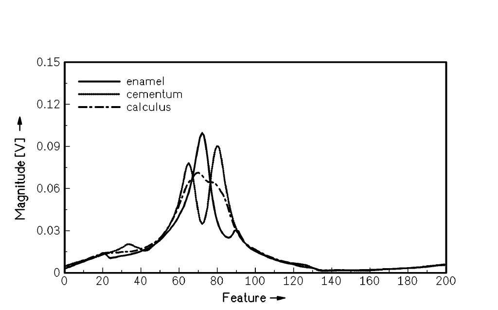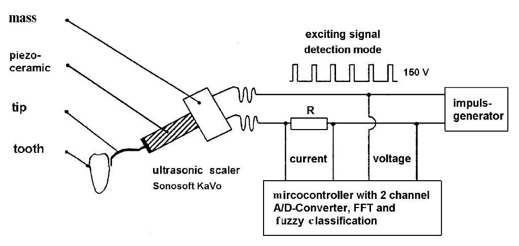 Wie funktioniert das Gerät? Ein piezokeramischer Oszillator wird an den Zahnschmelz, Zahnzement oder den Zahnstein gehalten, regt diesen zu Schwingungen an und mißt die Vibrationen der Oberfläche. Zahnschmelz, Zement und Zahnstein besitzen aufgrund ihrer verschiedenen elastischen Eigenschaften, der unterschiedlichen Kristallstruktur sowie Dichte und Oberflächenstruktur eine je charakteristische Resonanzschwingung, so daß, nach einer Reihe mathematischer Operationen (Fast-Fourier-Transformation, Fuzzy-Klassifikatoren, geeignete Merkmalskombination) eine klare Zuordnung, dies ist Zahnstein, dies ist Zahnzement, dies ist Zahnschmelz, möglich wird. Diese neue Funktionalität läßt sich in die bestehenden Zahnsteinentfernungsgeräte leicht integrieren.