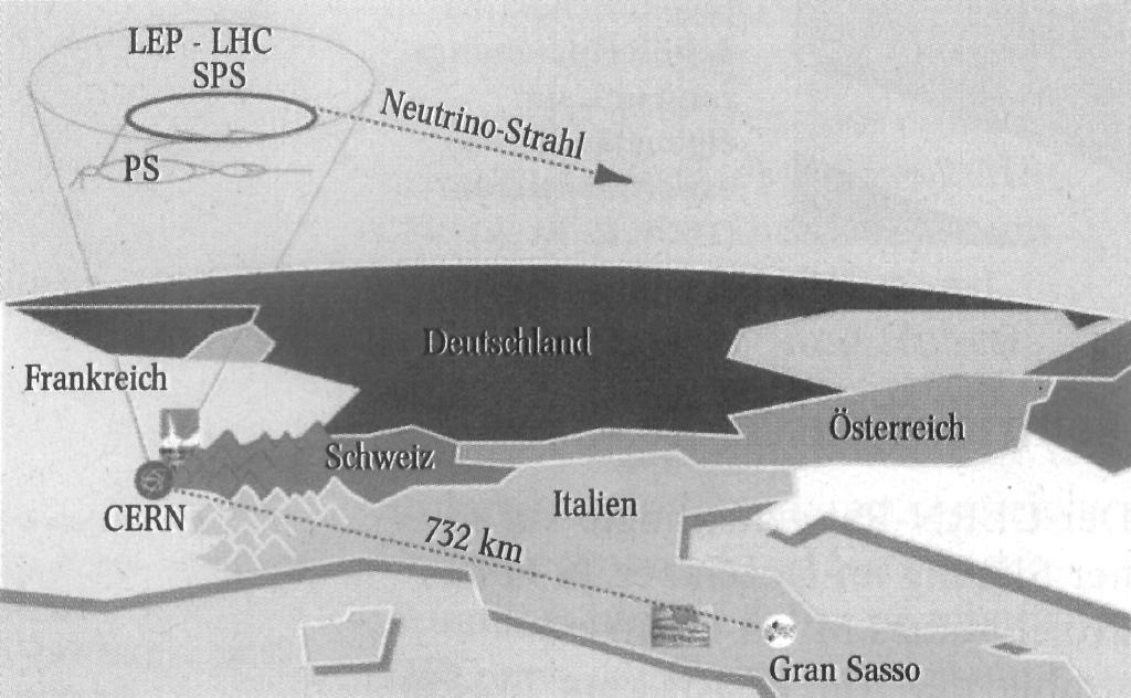 Wenn Neutrinos eine Masse besitzen, dann folgt daraus eine über-raschende Eigenschaft: die verschiedenen Neutrino-Arten können sich ineinander verwandeln. Diese Eigenschaft verrät, ob Neutrinos massebehaftet sind oder nicht und wird 'Neutrino-Oszillation' genannt. Nach dem Auftreten von Neutrino-Oszillationen wird mit dem OPERA-Detektor im Gran-Sasso-Massiv gesucht. Ergebnisse dieser Suche können wichtige Beiträge zur Klärung der Natur der sog. Dunklen Materie im Universum sowie der Widersprüche aus Messungen des Neutrinoflusses der Sonne liefern.