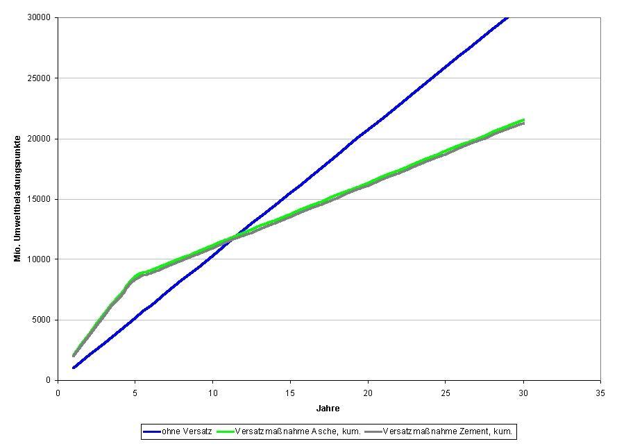 Anfänglich führte die Versatzmaßnahme zu einer Erhöhung der Umweltwirkung; auf Dauer ist sie eine geringere Umweltbelastung. Dies gilt sowohl für Versatzgemische auf Zement- wie auf Aschebasis Ökologisch sind Versatzgemische aus Zement und Asche nahezu gleich zu beurteilen. Versatzstoffe auf Zementbasis bestehen nur aus Komponenten, die Geld kosten. Bei der Verwendung von Kraftwerksaschen sind wenigsten für diese Erlöse zu erzielen, was sich kostensenkend auswirkt.