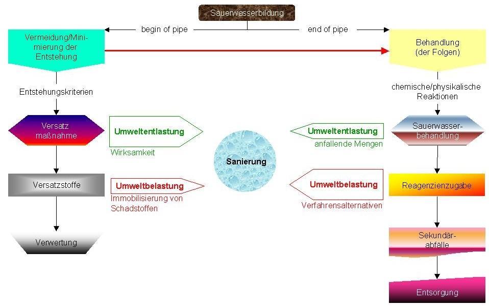 In Elbingerode stellte sich nach Ende des produktiven Bergbaus im Jahr 1990 die Ausgangssituation wie folgt dar: In den offenstehenden Abbauhohlräumen bildeten sich jährlich bis zu 3,3 Millionen Kubikmeter Sauerwasser mit pH-Werten bis unter 2 und mit Eisengehalten bis über 900 Milligramm pro Liter, in Ausnahmefällen bis über 2000 Milligramm pro Liter. Die Wässer müssen mit Pumpen nach über Tage gehoben und neutralisiert bzw. geklärt werden. Das ist mit einem enormen Verbrauch an Betriebs-, Hilfsstoffen und Energie verbunden. End of pipe-Technologien verlagern die Umweltproblematik, lösen sie nicht. Und da die Sauerwasserbildung von selbst erst nach Oxidation der freigelegten Sulfidmineraloberflächen zum Erliegen kommt, müßte die Wasserhebung und - klärung, verbunden mit Energie- und Reagenzienverbrauch sowie der Beseitigung anfallender Schlämme, auf Jahrtausende hinweg betrieben werden.