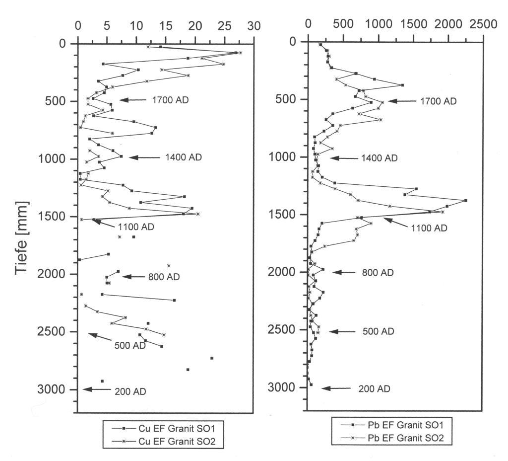 Was gibt die Natur preis? Der Harzer Bergbau ist viel älter als die schriftlichen Quellen vermuten ließen. Nicht erst im 10. Jahrhundert n. Chr., schon vor 2000 Jahren wurde Bergbau im Harz betrieben. Professor Dr. Wolfgang Brockner, TU Clausthal, untersuchte die Funde aus Düna - Erze/Erzrelikte, Metalle und Schlacken - auf ihre Elementzusammensetzung hin. So konnte die Erzeugung von Eisen, Kupfer, Blei und Silber aus den in der Nachbarschaft vorkommenden Eisenerzen, Oberharzer Gangerzen und auch aus Erzen der fast dreißig Kilometer entfernten Rammelsberglagerstätte bei Goslar nachgewiesen werden. Gestützt werden diese Ergebnisse von Untersuchungen an Torfschichten. Wächst, wie bei dem nahe Seesen gelegenen Erdfall "Silberhohl", eine Torfschicht ungestört und kontinuierlich über die Jahrhunderte hinweg, so ist ihr Profil ein Lesebuch wechselnder Intensität des Bergbaus, schlagen sich Hüttenräuche doch am Boden nieder. Bereits für die jüngere vorrömische Eisenzeit konnte eine zwar äußerst geringe, aber eindeutig vom Menschen her rührende Anreicherung von Blei, Cadmium, Kupfer und Zink in den "Jahresringen" der Torfschichten nachgewiesen werden (Professor Dr. Dr. h.c. Burkhard Frenzel und Dr. Heike Kempter, Universität Hohenheim).