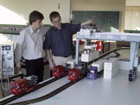 Eines der Exponate, die Modellanlage des Projektes »Kombinierter Verkehr«, (Abbildung) demonstriert, wie Güter in einigen Jahren im »virtuellen Zugver-band« transportiert und zwischen führerlosen Zugeinheiten und fahrerlosen LKW ausgetauscht werden können. Es entstand unter der Leitung von Prof. Dr. Jörn-Uwe Varchmin, emg, im Rahmen des Projektes »Bahn 2050« gemeinsam mit dem TU-Institut für Regelungs- und Automatisierungstechnik (Prof. Dr. Eckehard Schnieder), der Siemens-AG und der Fa. Götting KG.