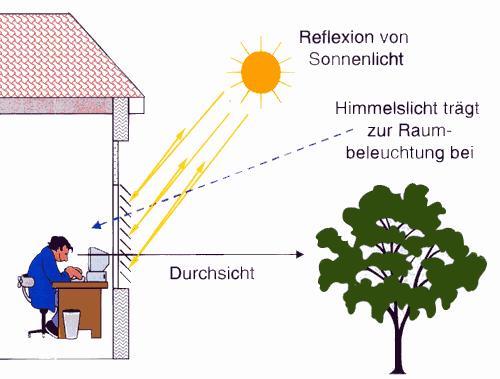 Die Funktionsweise des "transparenten Sonnenschutzes" ist verblüffend einfach. Die durchsichtigen Jalousien bestehen aus flachen Lamellen und ähneln damit ihren "gewöhnlichen" Schwestern. Die Lamellen selbst bestehen aus einer Glasumhüllung, in die zwei Folien mit einer prismenförmigen Oberflächenstruktur eingebettet sind. Die äußere Folie reflektiert das senkrecht einfallende, grelle Sonnenlicht vollständig und lässt das übrige Licht durch. Weil dieses dabei aber abgelenkt wird, muss die zweite Folie in Aktion treten und das Licht sozusagen wieder auf die richtige Bahn bringen. Ohne die zweite Folie würde sich eine Art Milchglaseffekt ergeben und man hätte alles andere als eine Jalousie mit ungehindertem Durchblick nach draußen.