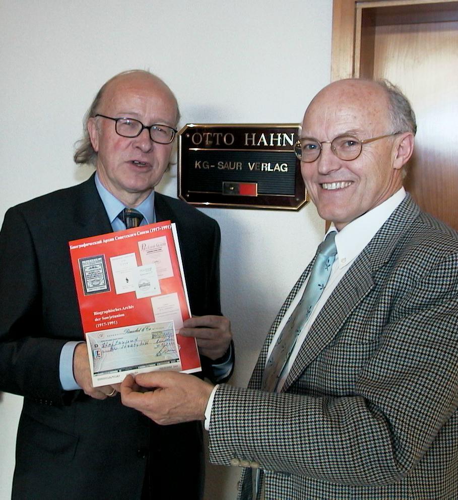 (pug) Dr. Dr. h.c. mult. Klaus Saur, Inhaber des Münchner Wissenschaftsverlages K. G. Saur, übergab am heutigen 4.12.2000 einen Scheck über 5.000,- DM an Prof. Dr. Elmar Mittler (Foto r.), den Direktor der Niedersächsischen Staats- und Universitätsbibliothek. Der Verleger beteiligt sich damit an der Spendenaktion zur Sicherung der durch eine vor allem wechselkursbedingte Kostenexplosion gefährdeten Göttinger Zeitschriftenbestände. "Eine reine Geldspende wäre für einen Verlag vielleicht nicht ganz passend", sagte Prof. Saur am Rande einer Konferenz im Hotel Am Papenberg, und übergab dem Bibliotheksdirektor zusätzlich eine wertvolle Mikrofiche-Ausgabe des "Biographischen Archivs Russland" im Wert von über 20.000,- DM, die künftig die Bestände der SUB bereichern wird.