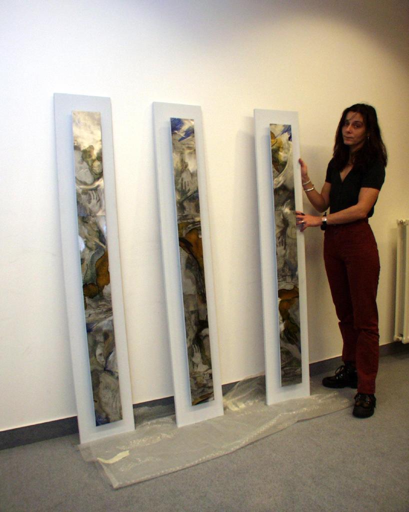 Gelsenkirchen. Leonardo da Vinci kennen Sie? Auch sein Bild vom letzten Abendmahl? Vertraut und doch ganz anders ist die dreiteilige Bildtafel von Claudia Lüke, die die Fachhochschule Gelsenkirchen auf ihrer nächsten Neujahrskarte abbildet und die mit finanzieller Hilfe durch die Sparkasse Gelsenkirchen und durch die Gelsenkirchener Hochschulfördergesellschaft für die Präsentation in der Hochschule angekauft wurde. Für das "Cenacolo" genannte Werk hat Lüke alte Druckplatten benutzt, mit denen früher einmal das Bild von da Vinci gedruckt wurde, genau genommen, der linke Teil der Abendmahlszene. Deshalb trägt das Werk auch den Zusatz "sinistra". Aus seiner früheren Verwendung trägt das neue Werk noch Spuren der alten Druckmotive, sodass der Betrachter Details wieder erkennen kann. Mit der künstlerischen Veränderung des Druckplattenmaterials, durch Kratzungen und neue Farben ergibt sich jedoch zugleich eine Fülle von neuen, assoziativ entstehenden Bildern. Cenacolo besteht aus drei Teilen, jedes ist 170 Zentimeter hoch und 28 Zentimeter breit. Das Werk ist aus dem Jahr 2000.
