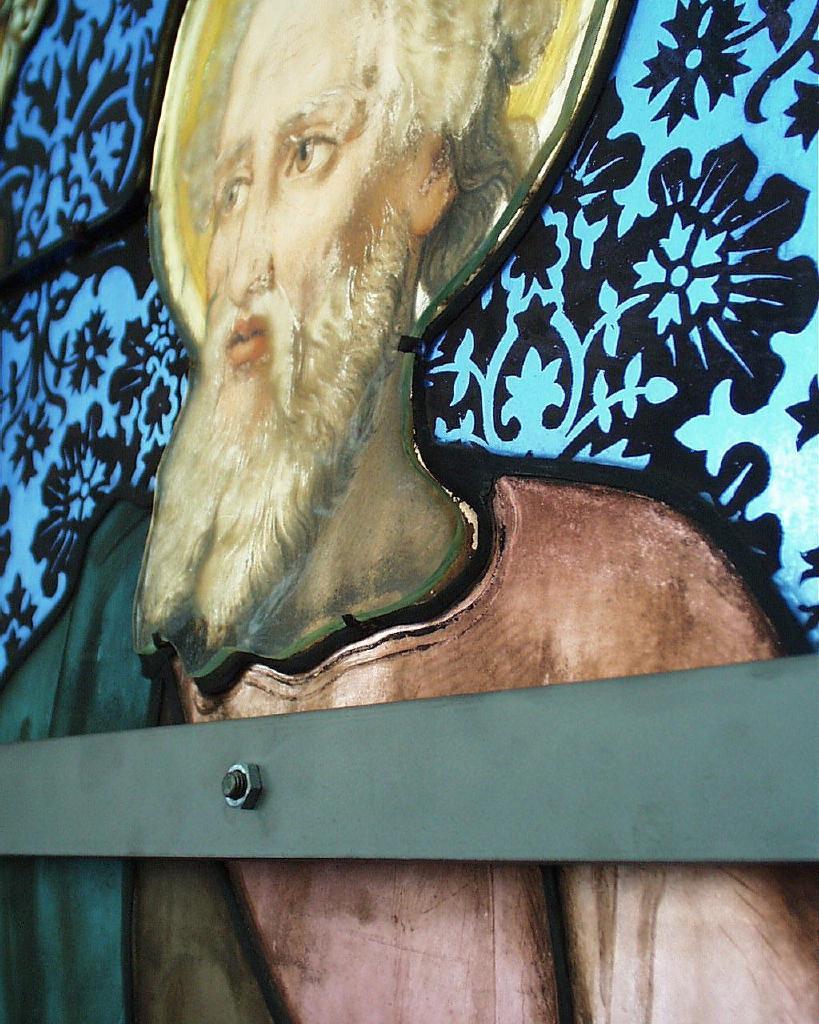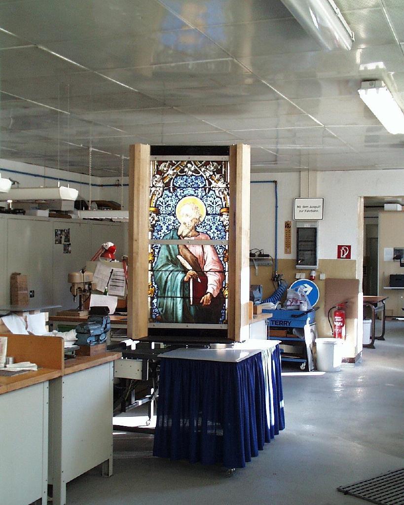 Bei dem Messeexponat handelt es sich um ein originales historisches Glasfenster aus der Johanneskirche in Saalfeld. Es stellt einen Evangelisten dar.