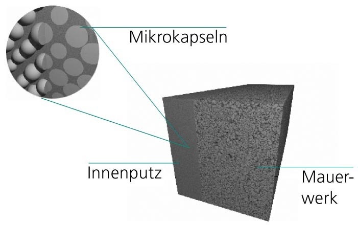 Together with industrial partners, the Fraunhofer Institute for Solar Energy Systems, ISE, developed building materials with micro-encapsulated paraffin. This wax-like additive greatly increases the thermal storage capacity of the indoor plaster and the dry building panels. A wall of 3 cm thickness has the thermal comfort of a concrete wall with a thickness of 40 cm. Thus,in summer the room remains at a pleasant temperature, and in winter the room does not cool down as quickly.