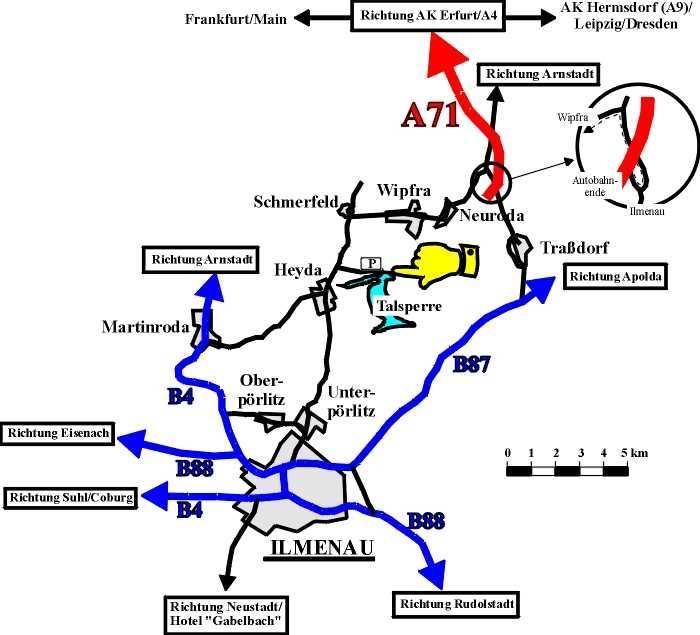 Die Anreise zur Talsperre Heyda ist aus unten stehender Skizze ersichtlich. In unmittelbarer Nähe des Präsentationsortes besteht die Möglichkeit zur Übernachtung und Versorgung.