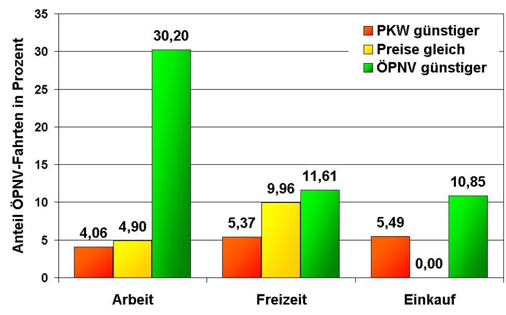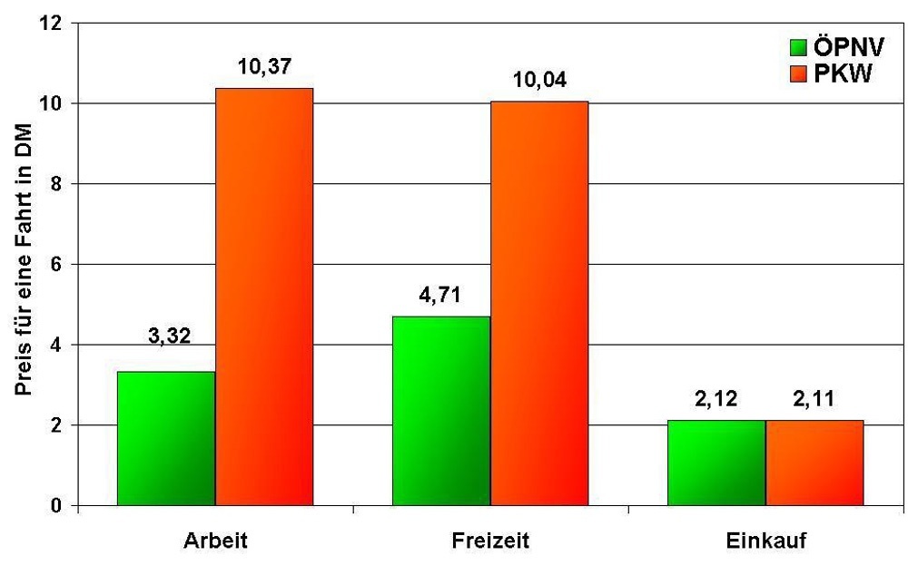 Drei Viertel der Befragten nutzen das Auto, um zur Arbeit zu fahren (77,1%), obwohl genau für diesen Weg der Preisunterschied zwischen PKW und ÖPNV am größten ist (10,37 DM für eine Fahrt mit dem PKW, 3,32 DM mit dem ÖPNV). Ein ähnliches Preisgefälle zeigt sich bei den Wegen zu Freizeitzielen, und hier ist der Anteil der PKW-Nutzer mit ca. 90 Prozent noch höher. Lediglich die Fahrt zum Einkaufen ist mit dem PKW genauso günstig wie mit dem ÖPNV, 93,7% der Befragten nutzen zu diesem Zweck ihr Auto.