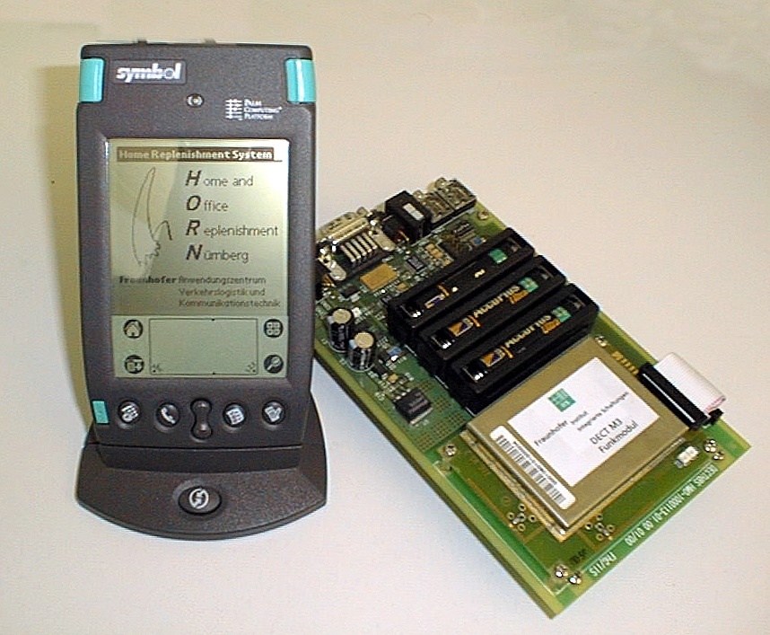 HORN, das »Home & Office Replenishment Nürnberg«-System füllt automatisiert Warenbestände nach. Es besteht aus mehreren Komponenten: Zentrales Gerät ist ein handelsüblicher persönlicher digitaler Assistent PDA der Firma symbol mit eingebautem Scanner. In ihn können nachzubestellende Waren über ihren Barcode eingelesen werden. Ein DECT-Modul, das am Fraunhofer-Institut für Integrierte Schaltungen IIS entwickelt wurde, bildet die Schnittstelle zum PC. Drückt der Anwender auf einen Knopf am PDA, so werden die Daten der Waren drahtlos in den PC eingelesen. Wenn sich auf dem Rechner das zum System gehörige Warenwirtschaftssystem befindet, wird der Bestand oder Bedarf automatisch aktualisiert. Wenn nicht, schickt der PDA automatisch eine E-Mail über den PC los. So oder so erfährt der beauftragte Dienstleister, welche und wieviele Artikel beim Kunden fehlen und liefert sie nach.
