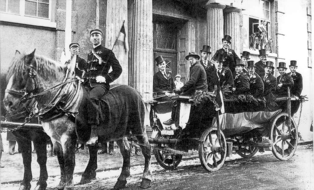 Nach dem Ende des ersten Weltkrieges nahm im Januar 1919 die Staatl. Württ. Maschinenbauschule Esslingen den Lehrbetrieb wieder auf. Die Studierenden waren, auch in den folgenden Jahren, meist Kriegsteilnehmer. Die Kandidaten des WS 1921/22 beschlossen, den Schluß des Studiums besonders eindrucksvoll und originell zu feiern. Sie besorgten sich einen mit Pferden bespannten Leiterwagen, auf dem alle 28 Kandidaten Platz nahmen und vom "Stall" aus durch die Straßen der Stadt fuhren. So wurde die erste "Kandidatenabfuhr" in Esslingen geboren.