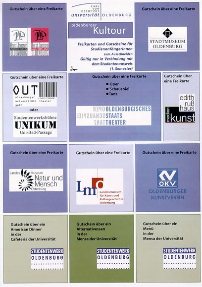 Auf diejenigen, die im kommenden Wintersemester ihr Studium an der Universität Oldenburg aufnehmen, wartet zur Begrüßung eine angenehme Überraschung: Freikarten und Gutscheine im Wert von rund 50 Mark bieten Kultur und Kulinarisches zum Nulltarif. Das Set mit dem Namen "Oldenburger Kultour" besteht aus Freikarten für das Staatstheater Oldenburg, das Horst-Janssen-Museum, das Landesmuseum Natur und Mensch, das Landesmuseum für Kunst und Kulturgeschichte, den Oldenburger Kunstverein, das Stadtmuseum und das Edith-Ruß-Haus für Medienkunst. Das Studentenwerk stellt eine Freikarte für das Universitätstheater OUT oder das UNIKUM sowie Gutscheine für unterschiedliche Menüs in der Mensa zur Verfügung.