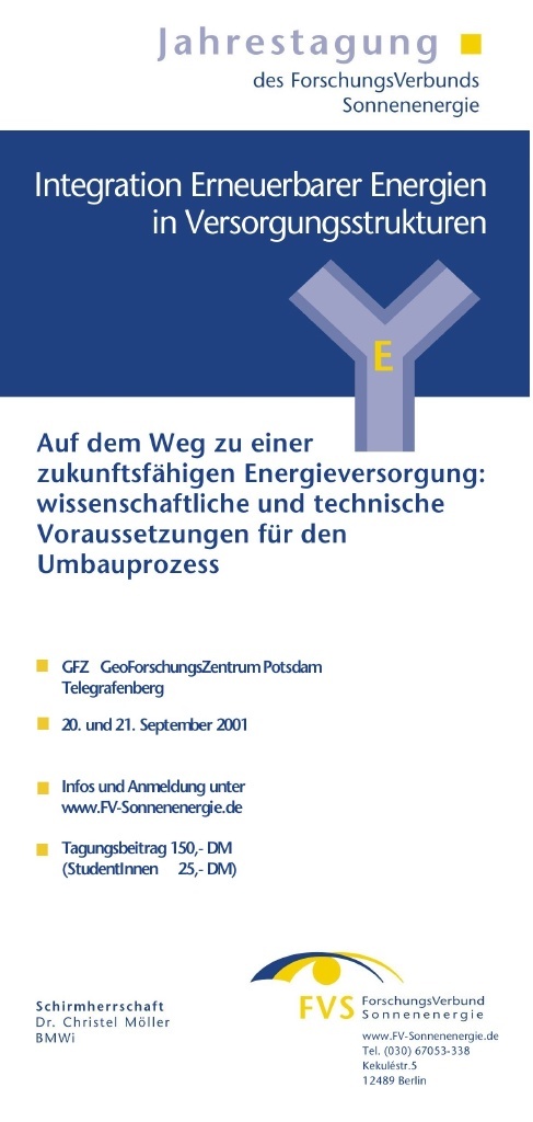 Zum Tagungsabschluß wird es traditionell eine PODIUMSDISKUSSION geben: Unter der Überschrift "Forschung und Markt - Partner oder Konkurrenten?" wird das Spannungsfeld zwischen Forschungs- und Entwicklungsbedarf und der forcierten Markteinführung von erneuerbaren Energien erörtert.
