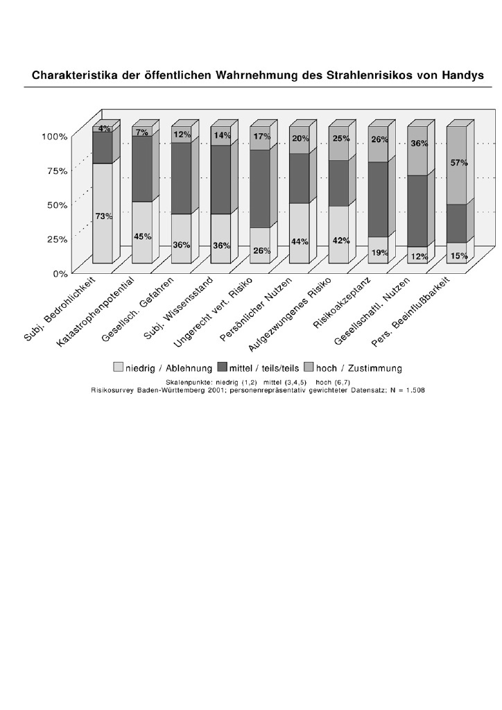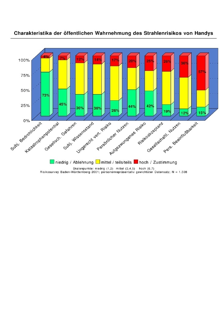Wissenschaft und Medien werden von den Befragten kritisiert, die Öffentlichkeit nur unzureichend mit Erkenntnissen und Informationen zu versorgen. "Nur etwa jeder Vierte ist mit der Leistung von Medien und Wissenschaft beim Thema Strahlenrisiko des Mobilfunks zufrieden", so Zwick. Mit dieser Unsicherheit gingen die Bürger aber unterschiedlich um, je nachdem, ob sie selbst ein Handy nutzen oder nicht. Personen, die selbst ein Handy nutzen, tendieren dazu, das Risiko als Alltags- und Allerweltsrisiko zu akzeptieren. Personen, die kein Handy besitzen und keinen Nutzen wahrnehmen, betonen dagegen die Risiken und ziehen eine negative Bilanz bei der Abwägung zwischen Nutzen und Risiko. Außerdem werde das Risiko in hohem Maße als persönlich kontrollierbar erlebt, je nachdem wie intensiv man ein Handy nutze. "Die Öffentlichkeit sieht die größte Gefahr durch Elektrosmog im eigenen Handy und nicht in den Sendeanlagen", so Zwick. Nur 19 Prozent der Befragten erscheine das Handyrisiko als nicht akzeptabel, lediglich drei Prozent würden im Falle eines Umzuges die Nähe zu einer Mobilfunksendeanlage meiden. "Die Öffentlichkeit im Lande ist weder risikoscheu noch technikfeindlich, aber eine schleichende Technikeinführung ohne ausreichende, direkte Bürgerbeteiligung zerstört das Vertrauen in Politik und Betreiber", kommentiert Zwick die Resultate der Studie.