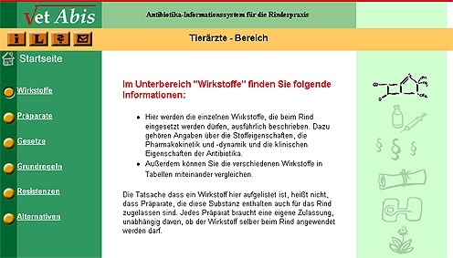 Um diesen unzureichenden Informationsfluss zu verbessern und aktuelle Fachinformationen zum Thema Antibiotika schnell und jederzeit zugänglich zur Verfügung zu stellen, hat sich Barbara Gooß des Mediums Internet bedient und eine neues Informationssystem erstellt: "VetAbis - das Antibiotika-Informationssystem für die Rinderpraxis". VetAbis soll den Tierarzt in der Rinderpraxis bei dem geforderten verantwortungsvollen Umgang mit Antibiotika unterstützen.