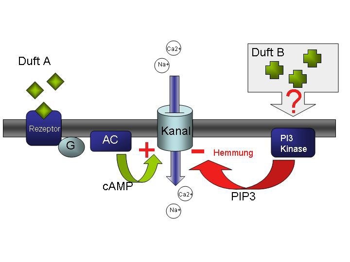 Um einzelne Neurone zu untersuchen, mussten sie zunächst mit Hilfe von Enzymen Zellen aus Stücken der Riechschleimhaut herauslösen. Die so isolierten Riechzellen beluden sie mit einem Indikatorfarbstoff (Fura-2), der Calcium anzeigt: Bei erhöhter Konzentration leuchtet er stark. Mit einer Spezialkamera und einem hoch auflösenden Mikroskop konnten die Forscher diese Leuchtkraftunterschiede als Reaktion der Sinneszellen auf eine Vielzahl von Düften messen. So gelang es auch, Duftstoffe zu identifizieren, die einen zweiten bisher unbekannten Signalweg (PI3-Kinaseweg) in Riechzellen aktivieren. Er hemmt die erregende Signalkaskade. Eine Mischung aus einem erregenden und einem hemmenden Duftstoff erzeugt an der Riechzelle keine Erregung mehr. Blockiert man den neu entdeckten Signalweg, kann die Zelle vorher geruchlose Duftsubstanzgemische plötzlich wahrnehmen.
