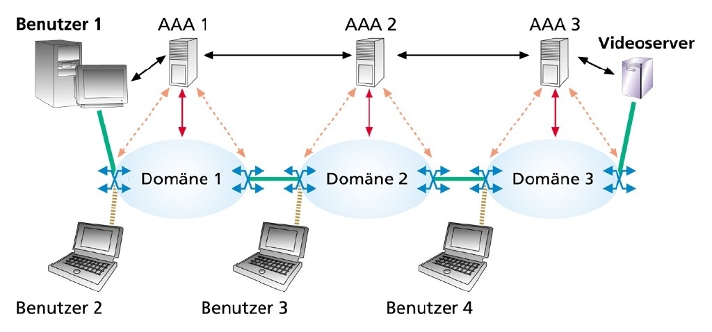 Ein typisches Szenario: Ein Benutzer fordert in seiner Domäne (z. B. fraunhofer.de) einen externen Streaming-Videodienst an. Sein Computer meldet die erforderliche Bandbreite einem AAA-Server, der Authentizität, Autorisierung und Accounting (Nutzungsinformationen des Teilnehmers) innerhalb der Domäne verwaltet. Er kommuniziert mit seinem AAA-Bruder, der Zugänge in der Nachbardomäne kontrolliert. Dies setzt sich fort, bis der Videoserver erreicht ist. Hier und in allen miteinander verbundenen Domänen ist der Benutzer registriert und alle AAA-Rechner schalten die für den Videodienst erforderliche Bandbreite frei. An den Schnittstellen der Domänen befinden sich Metering-Komponenten. Sie messen Bandbreiten und Nutzungszeiten, um die für den jeweiligen Kunden anfallenden Kosten zu ermitteln.