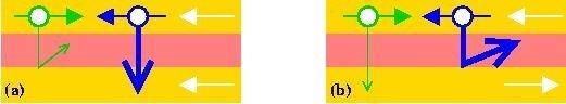 Die Elektronen können nun von dem einen Ferromagneten durch das unmagnetische Metall fließen. Dabei verlieren sie ihren Spinzustand nicht, sofern das Metall dünn genug ist. Treffen sie auf den zweiten Ferromagneten, dann werden die Elektronen, deren Spinzustand dem des zweiten Ferromagneten entgegengesetzt ist, häufig zurückgeworfen. Bei Elektronen mit dem anderen Spin kommt es dagegen seltener zur Streuung.