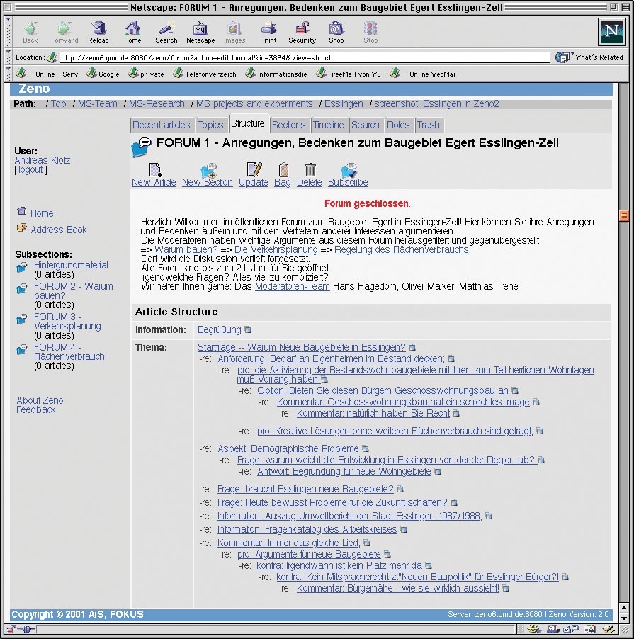Erfolgreich eingesetzt wurde Zeno unter anderem in den Stadt Esslingen. Vier Wochen lang diskutierten hier die Bürger mit der Stadtverwaltung über ein umstrittenes Neubaugebiet. Die Ergebnisse wurden durch die Moderatoren zusammengefasst und dem Planungsgremium präsentiert.