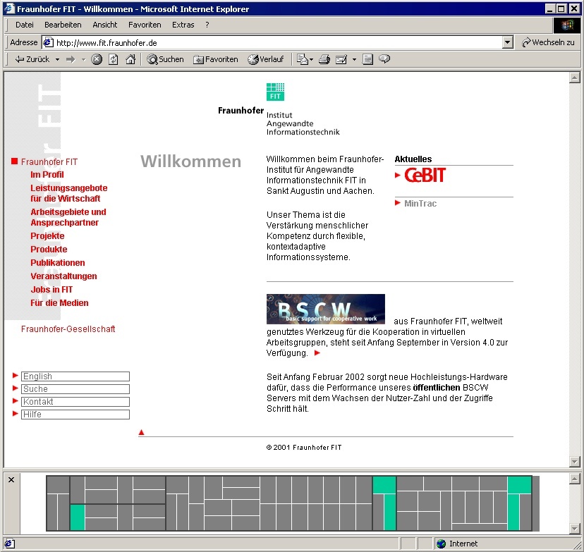 Sankt Augustin. Weit verzweigte Angebote und wenig Durchblick kennzeichnen viele Portale und Kaufhäuser im World Wide Web. Das neuartige Visualisierungswerkzeug SmartMaps, entwickelt am Fraunhofer-Institut für Angewandte Informationstechnik FIT, sorgt für mehr Orientierung, erleichtert Navigation und Interaktion. Komplexe Informationsbestände stellt der Web Service SmartMaps in kompakten kleinen Karten dar. Eingesetzt als Plug-in der weit verbreiteten Groupware BSCW symbolisieren die SmartMaps alle Dokumente eines Arbeitsbereichs. Unterschiedliche Farben signalisieren aktuelle Aktivitäten, also beispielsweise, welche Dokumente gerade bearbeitet werden.