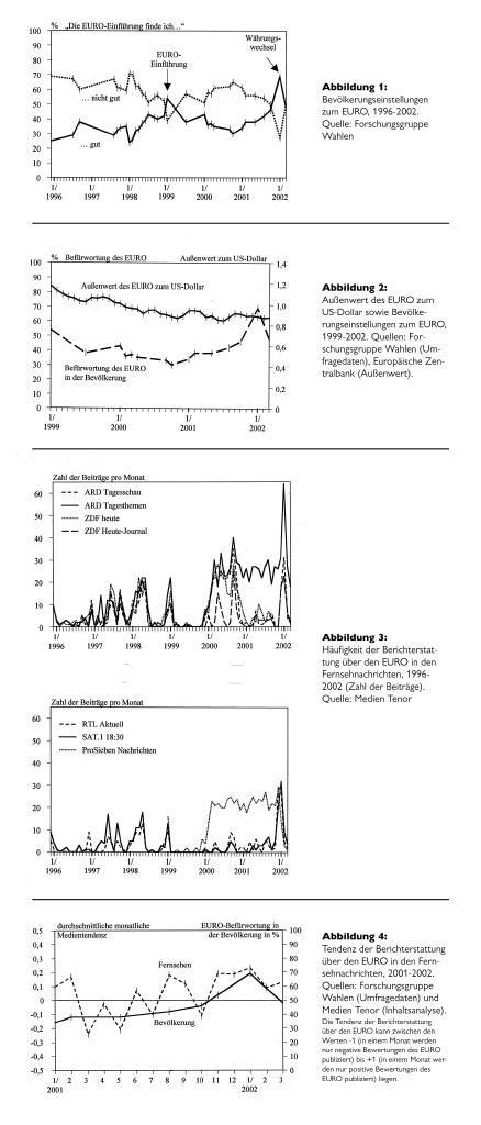 Für die Schwankungen in der EURO-Akzeptanz kommen im Wesentlichen zwei Ursachen in Betracht: Veränderungen der realen wirtschaftlichen Grundlagen und Veränderungen der Medienberichterstattung über den EURO. Verliert der EURO an Außenwert gegenüber dem US-Dollar, so lässt auch seine Befürwortung in der Bevölkerung nach. Vor allem der Wechselkurs-Rutsch in der ersten Hälfte des Jahres 1999 hat zu einem deutlichen Vertrauensverlust geführt. Kritiker sahen sich bestätigt, dass es sich beim EURO um eine instabile Währung handele. Allerdings nimmt in den Erholungsphasen des EURO die Zustimmung zu ihm auch wieder zu. Ab Anfang des Jahres 2001 entkoppeln sich jedoch die Einstellungen zum EURO und sein Außenwert: Während der Außenwert leicht sinkt, steigt die Befürwortung des EURO in der Bevölkerung deutlich an (vgl. Abbildung 2). Spätestens hier kommt die Medienberichterstattung ins Spiel.