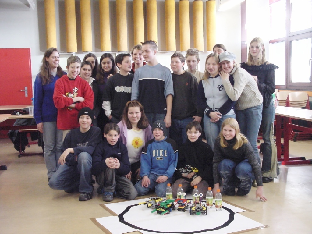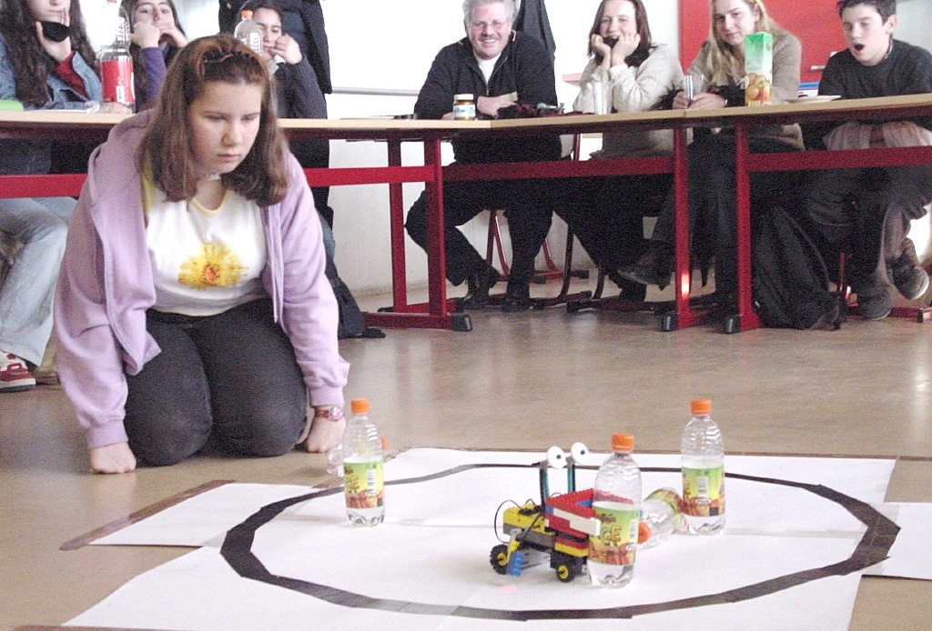 Die da mit selbstgebauten und -programmierten Robotern umgehen, sind keine Ingenieure oder FH-Studierende höherer Semester, es sind Schülerinnen und Schüler einer 7. Klasse der Bochumer Willy-Brandt-Gesamtschule. Fast fünf Monate lang - von September 2002 bis Februar 2003 - haben vier Gruppen an ihren Robotern ausprobiert, Ideen gesammelt, getüftelt, programmiert. Ihre Aufgabe: Aus einem Lego-Schulbaukasten einen Roboter bauen und so programmieren, dass er in der Lage ist, fünf in einem Kreis befindliche Flaschen zu erkennen und diese aus dem Kreis herauszuschieben.
