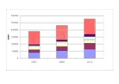 Wegen ihrer intensiven Nutzung sind insbesondere die Fernsehgeräte Energiefresser. Sie verbrauchen im Jahr 2010 voraussichtlich gut ein Fünftel der gesamten Energie für Informations- und Kommunikationstechnologien. Den stärksten Anstieg des Energieverbrauchs erwarten die Forscher aber bei den Mobilfunknetzen sowie beim Ausbau der Kommunikationsinfrastruktur in den Haushalten. Bei den Mobilfunknetzen steigt der Bedarf von heute etwas über eine Milliarde Kilowattstunden auf fast das Vierfache im Jahr 2010. Ursache dafür ist vor allem der Aufbau der UMTS-Netze, die einen sehr hohen Stromverbrauch haben. Der Anstieg im Haushalt hängt dagegen vor allem mit der Verbreitung von Breitbandanschlüssen wie DSL-Modems zu-sammen.