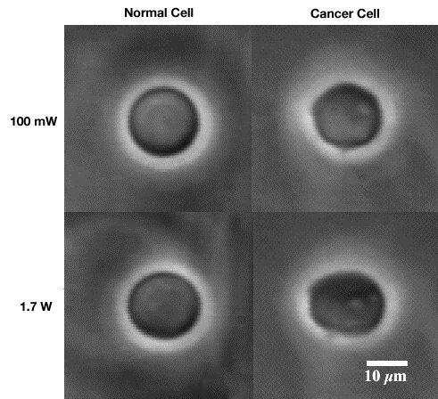 "Der Optische Strecker ermöglicht es uns, nach kranken Zellen zu 'fühlen' und nicht nur nach ihnen zu schauen", erklärt Dr. Guck. Kranke Zellen sind häufig weicher als gesunde Zellen. Außerdem unterscheiden sich Zelltypen nach ihrer Verformbarkeit. Krebszellen z.B. sind zwischen 2 und 10 mal weicher als gesunde Zellen und verformen sich unter dem Einfluss des Laserstrahls deutlich stärker als gesunde Zellen. Diese Eigenschaft macht sich das System des optischen Streckens zunutze.