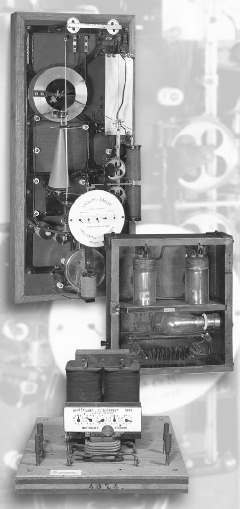 * dem ersten zur Massenfertigung tauglichen kWh-Zähler nach dem Induktionsprinzip, patentiert 1889 von dem ungarischen Erfinder Titus Plathy (im Bild unten)