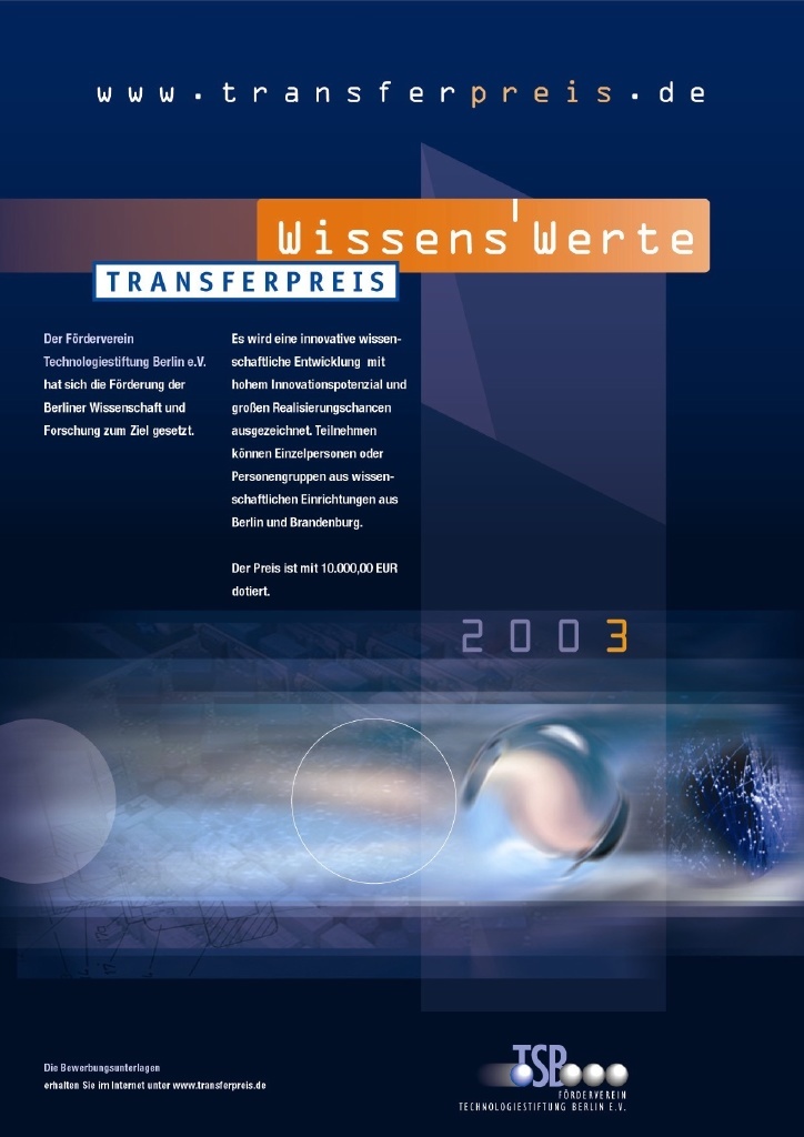 Erstmalig lobt der Förderverein Technologiestiftung Berlin e. V. den Transferpreis "WissensWerte" aus. Mit dem Preis soll eine wissenschaftliche Entwicklung ausgezeichnet werden, die ein hohes Innovationspotenzial besitzt und deren Umsetzung in die praktische Anwendung bereits eingeleitet wurde oder zumindest zeitnah erfolgen könnte. Der Förderverein, der sich das Ziel gesetzt hat, Wissenschaft und Forschung zu fördern, möchte damit deutlich machen, dass die herausragende Wissenschaftslandschaft Berlins und Brandenburgs ihre Existenz langfristig ausbauen und weiter entwickeln kann, wenn sie die Möglichkeit ergreift, ihre Forschungs- und Entwicklungspotenziale anwendungsorientiert umzusetzen.