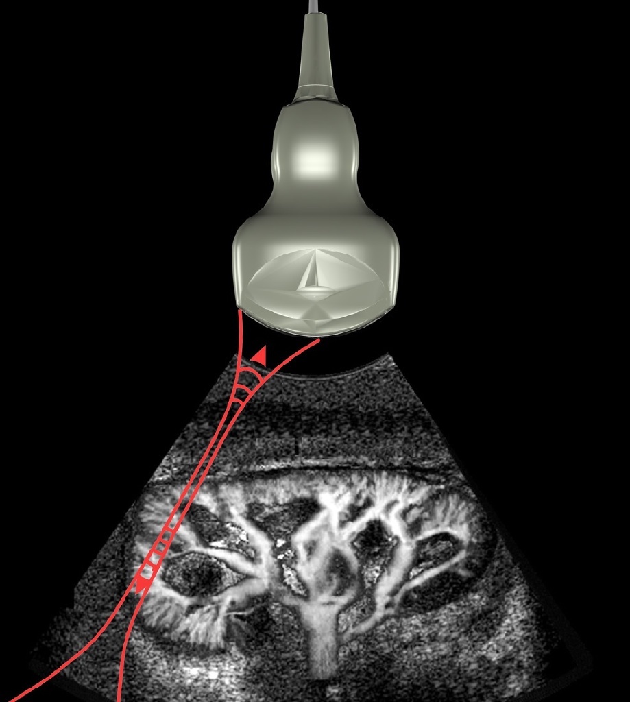 Suchten die Pioniere vor Jahrzehnten noch in schattenhaften Konturen des Körperinneren, so liefert Ultraschall heute Bilder und Filme hoher Auflösung. Inzwischen kann die Geschwindigkeit des Blutes gemessen oder die Verkalkung von Arterien beurteilt werden: Ist die Gefäßwand weniger elastisch, dehnt sie sich unter dem Einfluss des pulsierenden Blutdrucks nur noch wenig. Längenänderungen von unter einem Millimeter in Echtzeit messen zu können, stellt höchste Herausforderungen an die Ultraschallköpfe und die elektronische Verarbeitung der Echosignale. Bei modernen Geräten wird der Schall nicht einfach wie bei einem Lautsprecher kegelförmig abgestrahlt - vielmehr sendet der Kopf einen fokussierten und schwenkbaren Strahl aus. An Gewebestrukturen wie einer Gefäßwand wird er reflektiert und erreicht die Empfangssensoren des Kopfes. Signallaufzeit, -intensität und -richtung liefern die Informationen, aus denen Soft- und Hardware ähnlich wie beim Fernseher punkt- und zeilenweise ein Bild aufbauen.