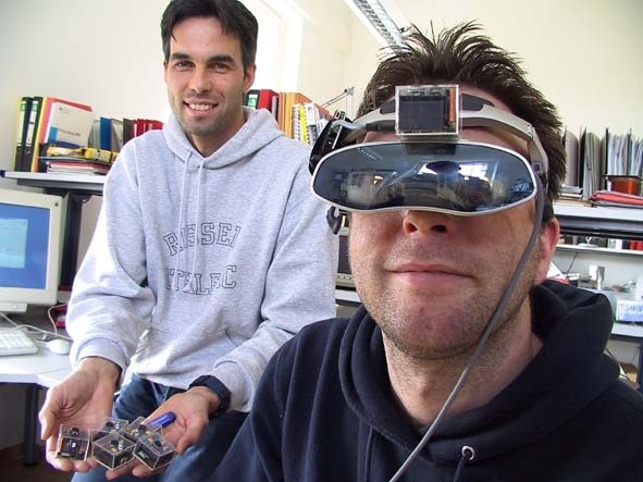 Dr. Hans Krüger, Lasse Klingbeil, Edgar Kraft und Rene Hamburger vom Physikalischen Institut der Universität Bonn haben mit BlueTrak ein kleines und einfach zu handhabendes System entwickelt, das bis zu vierzig mal in der Sekunde die Position und Blickrichtung sämtlicher Akteure bestimmt - und das auf wenige Millimeter genau. Das Messprinzip ähnelt dem des Global Positioning Systems (GPS), das beispielsweise das Navigationssystem im Auto mit Ortsangaben versorgt. "Wir befestigen irgendwo im Raum drei Referenz-Sender, die alle 25 Millisekunden einen Ultraschall-Ton und gleichzeitig einen Infrarot-Lichtpuls aussenden", erklärt Dr. Krüger. "Jeder Akteur trägt an seiner Brille einen Empfänger, der registriert, wann Schall und Licht bei ihm ankommen. Schall breitet sich deutlich langsamer aus als Licht; aus der Zeitdifferenz kann der Computer daher den Abstand zum entsprechenden Referenz-Sender berechnen." Die Abstände zu den drei Sendern ergeben die Position des Empfängers. "Wenn wir auf dem linken und dem rechten Brillenbügel ein Ultraschall-Mikro befestigen, erhalten wir sogar zwei Positionsangaben, aus denen wir die Drehrichtung des Kopfes bestimmen können", ergänzt Lasse Klingbeil.