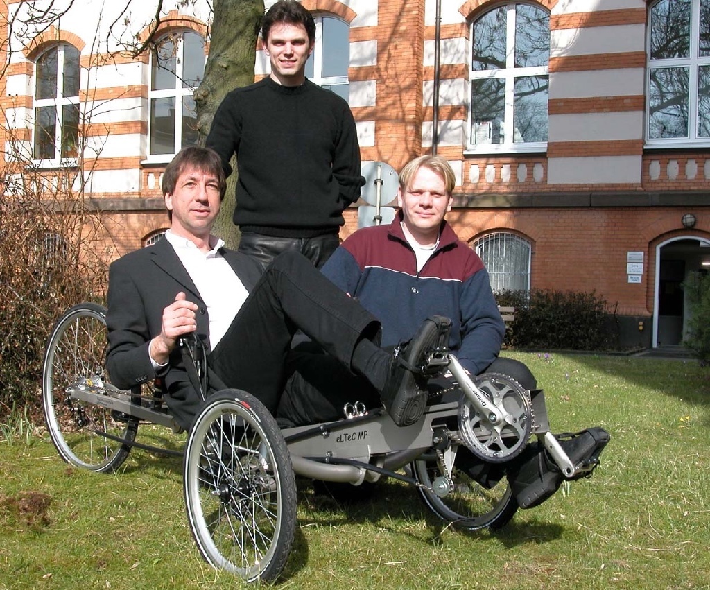 Extrem leicht ist es, dabei sportlich und sicher durch seine tiefe Schwerpunktlage: Beim brandneuen, an der FH Dortmund entwickelten Liege-Dreirad "eLTeC" gibt es den besonderen Fahrspaß inklusive. Die Fahrzeug- und Verkehrstechnikstudenten Michael Macha und Jens Prieß haben das originelle Gefährt mit 14-Gang-Getriebe, zwei gelenkten Vorderrädern und einem angetriebenen Hinterrad im Rahmen ihrer Diplomarbeit am Computer konstruiert, optimiert und dann in klassischer Handarbeit gefertigt. Zusammen mit Prof. Dr. Wilfried Fischer vom Fachbereich Maschinenbau stellen sie den Prototypen jetzt auf der Computermesse CeBIt in Hannover vor.