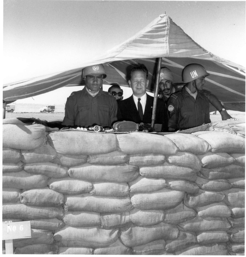 "Ähnlich wie heute", so Fröhlich, "schien alles auf eine unausweichliche militärische Aktion hinauszulaufen". Nach einem israelischen Angriff sollten britisch-französische Interventionstruppen die ägyptischen und israelischen Streitkräfte trennen. Die politische Innovation Hammarskjölds bestand nun darin, eine multinationale Friedenstruppe anstelle der rein britisch-französischen einzusetzen. Innerhalb weniger Tage wurde die Truppe mit Unterstützung einer Reihe von Staaten (u. a. den USA) aufgestellt und ihr Mandat erarbeitet. Solche raschen Aktionen hatte keiner von der UN, geschweige denn von ihrem Generalsekretär erwartet. Bei seinem Amtsantritt 1953 galt der schwedische Finanz- und Wirtschaftsfachmann Hammarskjöld als Technokrat, dem man keine großen Visionen zutraute. Die UN selbst war eine junge Organisation, die inmitten des Ost-West-Konflikts durch den Anspruch der Unparteilichkeit kaum eine große Rolle spielte. Um so verblüffter war die Welt, als der vermeintliche Technokrat die Rolle der Weltorganisation neu definierte.