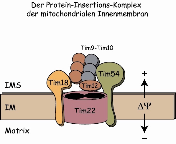 Eine dieser Translokasen ist der sog. Protein-Insertions-Komplex TIM22, der aus insgesamt sechs verschiedenen Proteinen besteht, von denen eine Proteinuntereinheit eine Pore bildet, die vom elektrochemischen Potential über der inneren Membran gesteuert wird. Der TIM22 Komplex transportiert solche Proteine, die die innere Membran mehrfach durchspannen. Seine Beteiligung am Einbau von Proteinen in die innere Mitochondrienmembran ist seit längerem bekannt, doch gab es bislang noch keinen Hinweis darauf, wie dieser Prozess abläuft und welchen Einfluss das elektrische Membranpotential auf den Insertionsablauf ausübt.