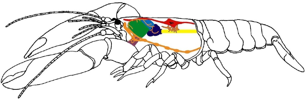 Drei rotbraune, raspelartige Zähne kommen zu Tage - eine anatomische Anpassung an ungewöhnliche Essmanieren. Mit den Scheren zerreißen Krebstiere das Futter nur grob, bugsieren es dann mit Hilfe der Manibeln (kleinen Mundwerkzeugen) in den Ösophagus, eine Art Speiseröhre. Im sich anschließenden Speisesack wird enzymatisch vorverdauert, dann geht es weiter in die "Gastrische Mühle", wo die Zähne das Fressen zerreiben. Im vierten Magenteil, dem Pylorus, werden schließlich die Nährstoffe aus dem Brei gefiltert. Nach zwei Stunden Feinstarbeit ist es soweit. Das Nervensystem ist vom Magen getrennt und wird nun mit feinen Nadeln in einer Petrischale aufgespannt.
