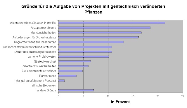 Die Gründe für die Zurückhaltung in Europa sind vielfältig. Zusätzlich zu dem Moratorium, auf das sich der EU-Umweltministerrat 1999 geeinigt hatte, ist die Akzeptanz gentechnisch veränderter Produkte bei den Verbrauchern ausgesprochen niedrig. Daraus ergeben sich erhebliche Marktunsicherheiten für die Hersteller. So ist es nicht verwunderlich, dass vornehmlich multinationale, finanzkräftige Firmen auf diesem Gebiet aktiv sind. Sie führen gut 65 Prozent aller Freisetzungsversuche durch. Kleine oder mittlere Unternehmen sind mit einem Anteil von 6 Prozent dagegen wesentlich zurückhaltender und versuchen sich vorwiegend in Nischenmärkten zu positionieren. Der Rest der Freisetzungen entfällt auf öffentliche Forschungsstätten, Universitäten oder andere Einrichtungen.