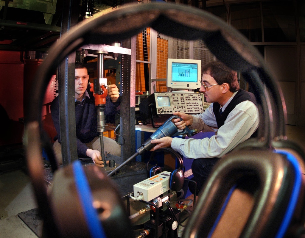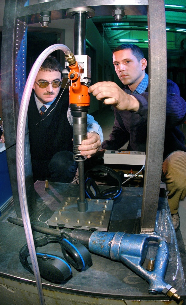 Um das Forschungsmuster testen zu können, wurde am Institut für Betriebswissenschaften und Fabriksysteme der TU Chemnitz ein eigener Versuchsstand entwickelt. Handelsübliche Pneumatikhämmer der Klasse um 6 Kilogramm wurden hier monatelang getestet und hinsichtlich ihrer Wirkung auf das Hand-Armsystem bewertet. Anpresskraft, Dämpfungsverhalten, mechanische Impedanz des Hand-Arm-Systems des Bedieners sowie der Wirkwinkel wurden bei allen Versuchen konstant gehalten. Die Chemnitzer Forscher um Prof. Dr. Hartmut Enderlein wollen aus diesen Erfahrungen heraus künftig ein Verfahren zur vergleichenden Bewertung von Drucklufthämmern bzw. der Schädigungen durch die Arbeit mit Pneumatikwerkzeugen entwickeln. Bereits jetzt zeichnet sich ab, dass ein neuer Drucklufthammer - made in Sachsen - dank seiner ergonomischen Gestaltung die DIN-Grenzwerte unterschreiten wird.