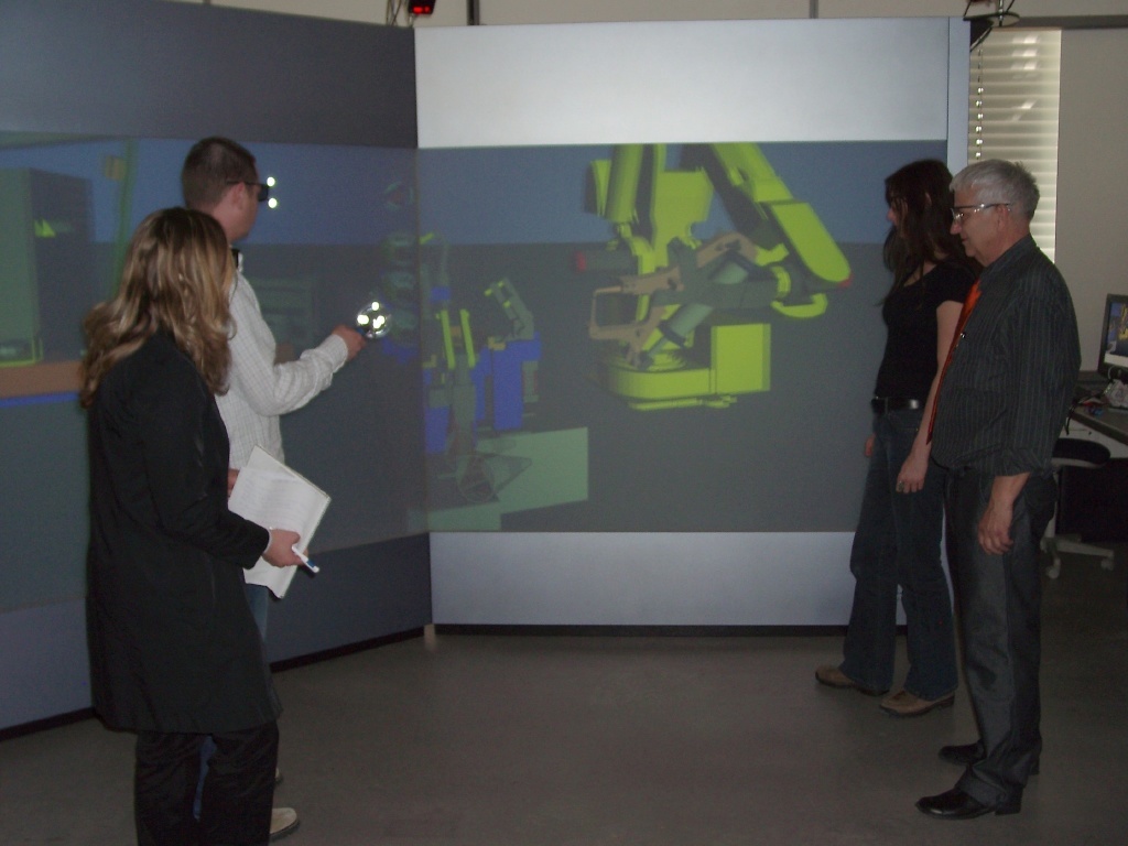 Mit dem Immersiven Projektionssystem hat die virtuelle Welt eine wesentliche Erweiterung erfahren. Auf großflächige Wänden werden von hinten Maschinen und Personen projiziert, mit denen man auf einfache Weise interagieren kann. Eine 3D-Brille auf der Nase und eine ferngesteuerte Maus mit der Form eines magischen Zepters in der Hand, dreht man spielerisch die Objekte nach allen Seiten, betrachtet sie von oben, von unten oder von der Seite - so dass man nach ihnen greifen möchte. Vielleicht haben die Programmierer des Rennwagens ja deshalb auf das Detail des Zündschlüssels verzichtet, damit sich niemand unfreiwillig auf den Boden setzt, in der Absicht, den Boliden aus dem Labor der FH zu steuern. Die virtuelle Welt hat hier von den Miniaturen auf dem Monitor zur Originalgröße gefunden.