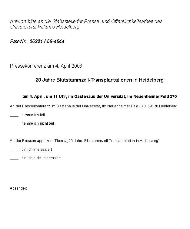 einladen. Als Gesprächspartner stehen Ihnen Prof. Dr. Anthony Ho und seine Mitarbeiter sowie Patienten, die in Heidelberg transplantiert worden sind, zur Verfügung. Themen sind neben dem historischen Ereignis der ersten Stammzelltransplantation die aktuellen Ergebnisse der Blutstammzelltransplantation sowie Perspektiven bei der Erforschung adulter Stammzellen.