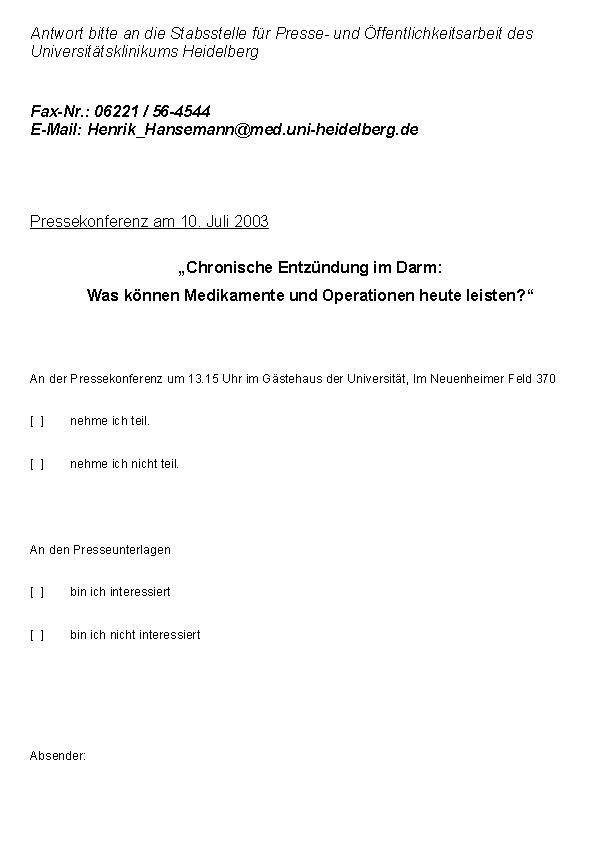 Wir laden Sie herzlich ein zur Pressekonferenz am Donnerstag, dem 10. Juli 2003 um 13.15 Uhr im Gästehaus der Universität, Im Neuenheimer Feld 370